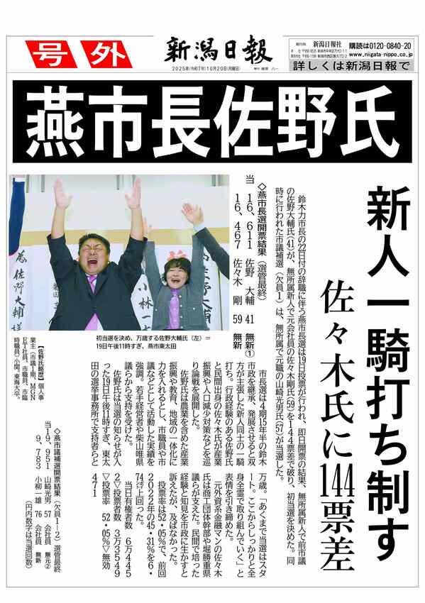 【号外】燕市の新市長に前市議の佐野大輔氏 2025/10/20 0:10 (最終更新: 2025/10/20 0:15) PDFで号外を見る トップページで最新情報を見る 関連ニュース 【号外】新潟県知事が柏崎刈羽原発再稼働を容認 11/21 【号外】日経平均初の5万円台 10/27 【号外】新首相に高市早苗氏、女性で初めて選出 10/21 【号外】北信越高校野球・帝京長岡が優勝 10/19 【号外】公明党が連立政権離脱へ 10/10 【号外】ガザ全人質解放へ 10/9 【号外】ノーベル化学賞に北川進京都大特別教授 10/8 ノーベル化学賞に京都大特別教授の北川進氏ら 10/8 【号外】ノーベル生理学・医学賞に大阪大栄誉教授の坂口志文氏ら3氏 10/6 【号外】自民党新総裁に高市早苗氏 10/4 【号外】石破茂首相が辞任の意向 9/7 【熱中症に注意】新潟県内に熱中症警戒アラート発表中(8月26日) 8/26