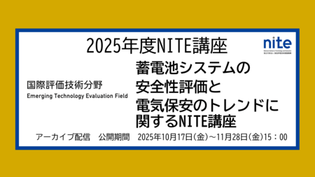独立行政法人製品評価技術基盤機構 【NITE(ナイト)、理事長:長谷川 史彦、本所:東京都渋谷区西原】は、毎年多くの受講者からご好評いただいている NITE講座の1つとして「蓄電池システムの安全性評価と電気保安のトレンドに関するNITE講座 」の講義動画のアーカイブ配信を開始しました。