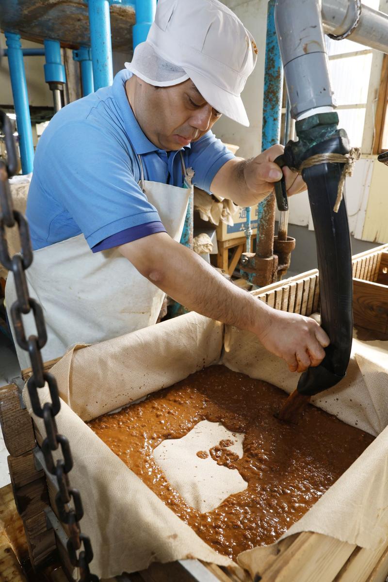 仕込みの蔵では毎年5月ごろ、蒸した大豆、いった小麦でこうじを作る。塩水と混ぜ、1年から1年半かけて発酵、熟成させたもろみを搾ると、しょうゆの原液になる。古くからある機械や道具の修繕を重ね、大切に使っている。