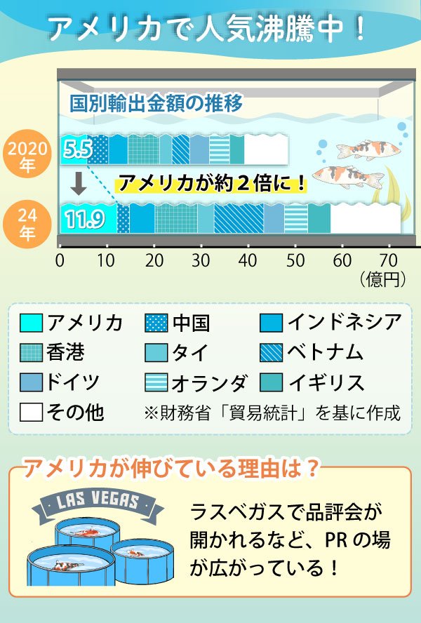 昔から芸術品やペットとして庭の池で錦鯉を楽しんでいたヨーロッパや、縁起物としての言い伝えがあるアジアが上位にランクインしています。そんな中、直近5年間で順調に伸びているのがアメリカです。県農林水産部は、ラスベガスで品評会がはじまり、新潟県の生産者などが審査員として出向いてPRしていることが理由の一つだと分析します。
