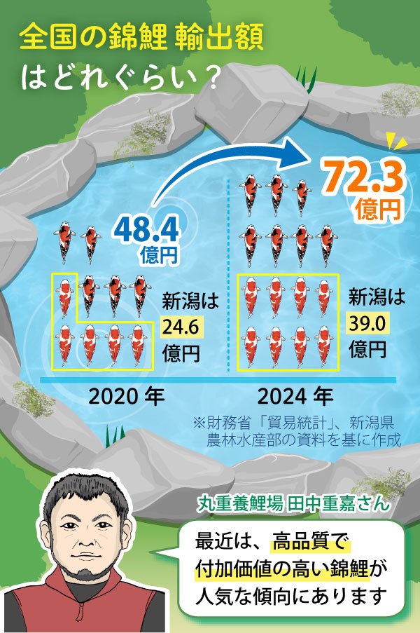 「新潟に就職したからには、大好きな錦鯉を伝えたい!」。中学生の時、京都の平等院鳳凰堂の池で泳いでいた錦鯉の美しさに引かれて7年。香川県出身で、錦鯉を描くことが趣味の入社2年目のデザイナー(23)が、発祥の地である小千谷市と長岡市の山古志地域を訪問しました。皆さんは、錦鯉が海外で大人気なのを知っていますか。人気の理由やどうやって輸出をするのか。錦鯉を飼育・販売する養鯉場に聞きました。