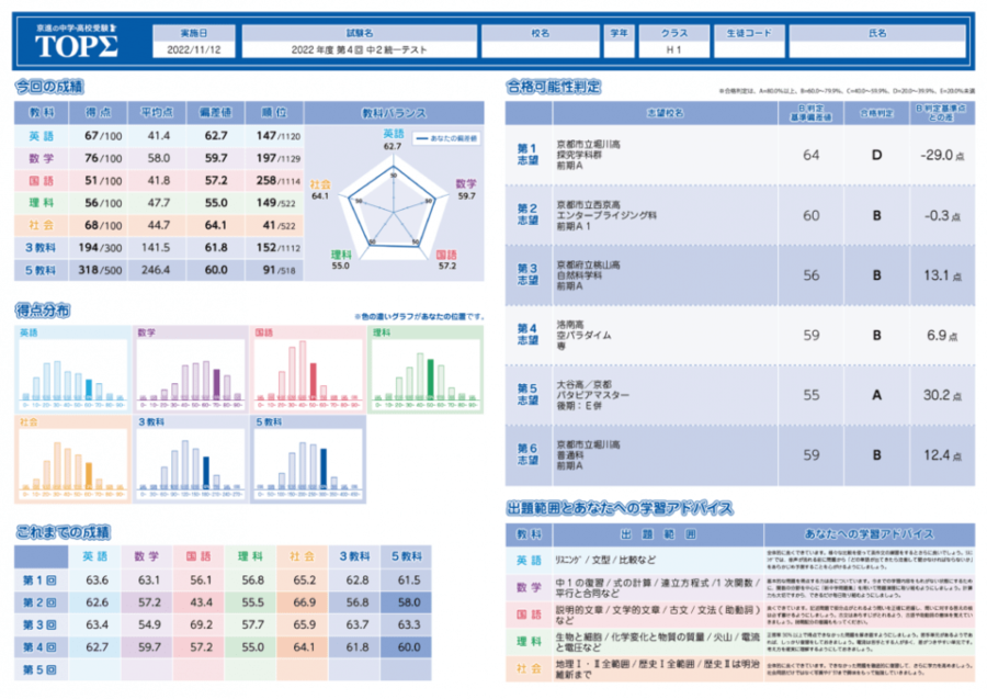高校受験を見据えた「公開統一テスト」は、本格的な5教科実力テストで、受験後に返却される成績表には得意・苦手分野が細かく分析されています。これにより、自分が受験者全体の中でどの位置にいるかを把握できるほか、最大6校分の志望校合格判定や課題の明確化が可能です。