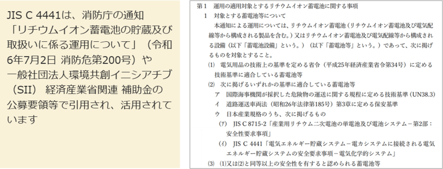 ●一方で、BESSは,十数年と長期にわたって使用する可能性があり,当初予定していなかった変更を実施する場合が多々ありますが、IEC 62933-5-2ではその部分まで規定していませんでした。そこで,適切な長期運用管理を実施するため,BESSの設置場所を変更したり、自動車等に使用されていた中古の蓄電池をBESSで再利用したりする場合等の安全要求事項を、日本からIEC/TC120に提案し、IEC 62933-5-3が2023(令和5)年10月10日に発行されました。この規格原案の開発を行ったNITEは、国内市場の取引要件や行政機関・地方公共団体による基準策定での更なる規格活用を見越して、国内対応規格となる日本産業規格(JIS)原案作成に参画し、NITE職員が原案作成委員会の幹事を務めました。そしてこのたび日本産業標準調査会(JISC)での審議を経て、2025(令和7)年10月20日に「JIS C 4442:電気エネルギー貯蔵システム -電力システムに接続される電気エネルギー貯蔵システムの安全要求事項- 電気化学的システムの計画外変更の実施」が発行されました。