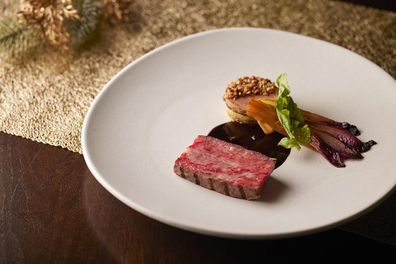 ― ジューシーに焼き上げた国産牛サーロインをメインに、じゃがいも、フォアグラ、ヘーゼルナッツのキャラメリゼの層が美しく食感の違いも楽しめるトルタと、バルサミコ風味のアンディーブが濃厚な肉の旨みを引き立てます。芳醇な香りと深いコクをまとったトリュフソースが生み出す、贅沢な一皿。