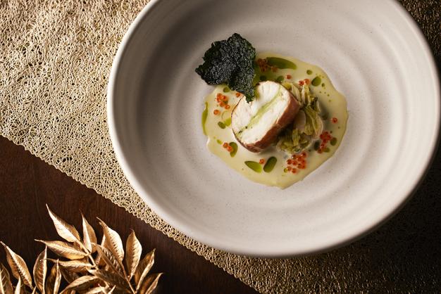 ― 生ハムで巻いた平目に帆立のムースとハーブを重ね、低温調理でしっとりと仕上げた後に香ばしく焼き上げた逸品。ホワイトのソースにフィヨルドルビーの赤とカーボロネロのグリーンが映え、クリスマスムードを感じさせる彩りの仕立て。