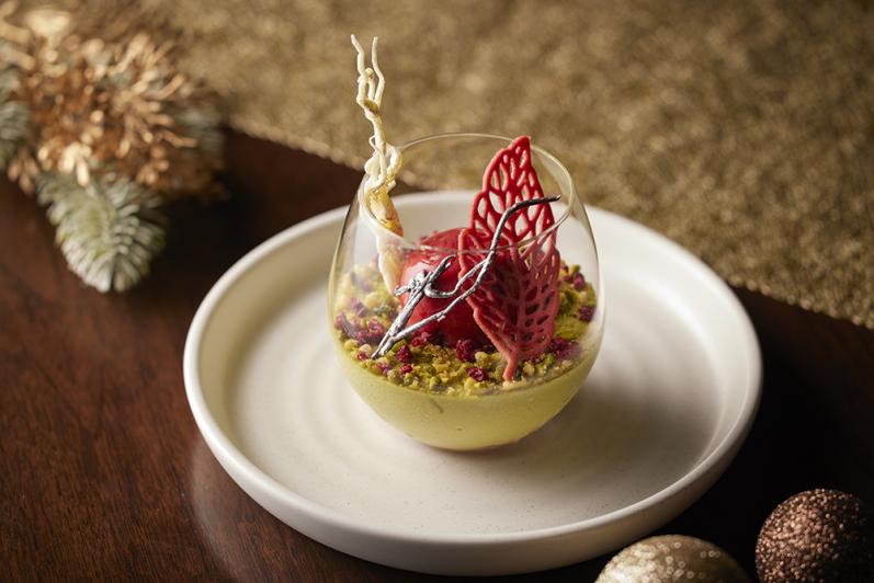 ― 濃厚なピスタチオが香るティラミスに、ラズベリーシャーベットの酸味を合わせた、グリーンとレッドのコントラストがクリスマスらしい優美なデザート。