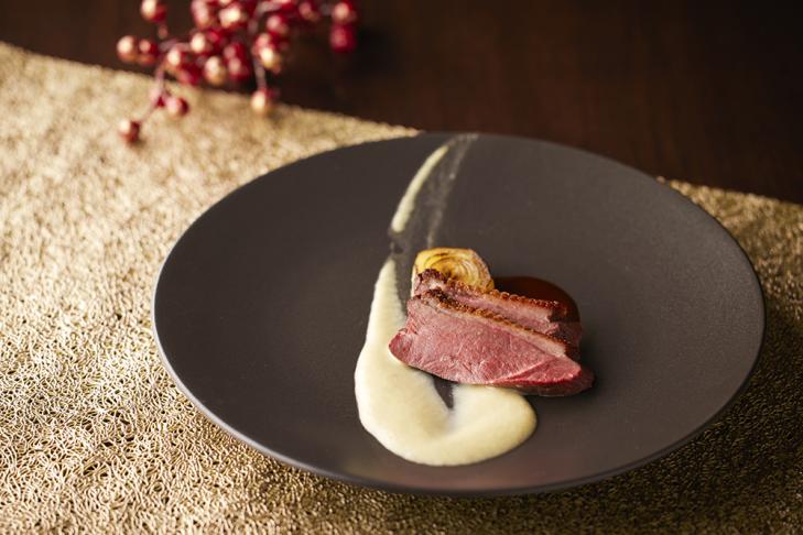 ― 旨み豊かな津軽かもをなめらかなポロ葱のピュレと合わせ、冬らしい滋味を感じさせる一品。