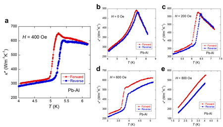 本研究では、高純度(5N)のPb線とAl線をSn-Pbハンダで接合し、有効熱伝導率(κ*)[8]を測定しました。図2(a)に測定セットアップ(順方向)を示します。ヒーターで温度差を生じさせ、温度差と熱流量から有効熱伝導率の温度依存性を測定しました。例えば、接合の中央がPbの超伝導転移温度(H = 0 Oeで7.2 K、H = 400 Oeで5.2 Kのように磁場印加で低下する)のとき、図2(b)に示す通り順方向測定ではPb線も常伝導状態のため高い有効熱伝導率を示します。一方、逆方向の場合はPb線が超伝導状態となるため、有効熱伝導率が低くなります。この違いを利用することで熱整流が実現します。