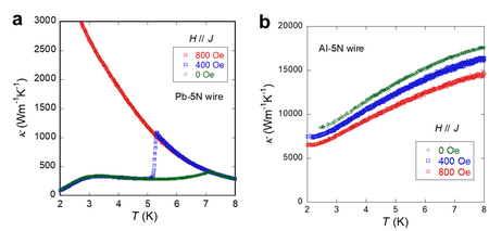 【画像:https://kyodonewsprwire.jp/img/202510177350-O4-D2g3t361】 図1. (a)Pb線(純度:5N)と(b)Al線(純度:5N)の磁場中での熱伝導率の温度依存性。