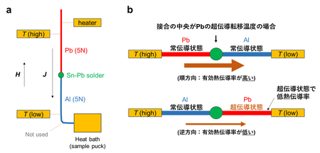 ・高純度のPb線(超伝導体)とAl線(2 K以上で常伝導体)をハンダ接合することで、熱ダイオードを作製。