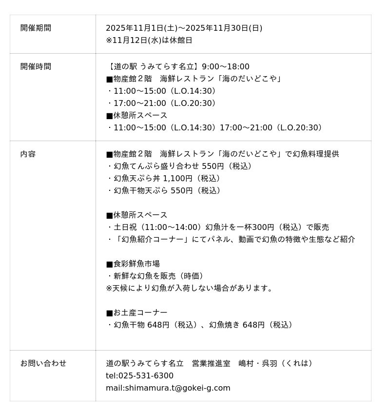 株式会社ゆめ企画名立(本社:新潟県上越市、代表取締役:細谷 貴雄)が運営する「道の駅 うみてらす名立」では、2025年11月1日(土)から11月30日(日)までの期間、名立漁港で水揚げされた“幻魚(げんぎょ)”をテーマにした「幻魚フェア」を開催します。