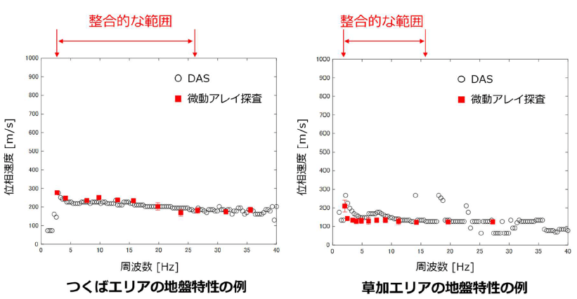 結果の一例を図4に示します。図4は、つくばエリアと草加エリアの実験サイトの常時微動に含まれる振動について、各周波数の波が地盤を伝搬する速度(位相速度)を解析した結果を示しています。なお、DASによる結果は約1日分、微動アレイ探査による結果は約20分間の振動データをもとに解析した結果を示しています。約3 Hz~約20Hz以下の範囲において、おおむね整合的な結果が得られました。周波数とその振動に影響を与える地盤の深さは相関があり、たとえば低い周波数ほどより深い地盤の情報を持っていることが知られています。今回、整合的な結果が得られた範囲の位相速度の大きさから深さに換算すると、おおむね約3m~30mの深さの地盤特性が得られていることになります。これは、既に設置されている通信光ファイバーを用いることで、現地で作業が必要な微動アレイ探査とほぼ同等の精度で、広範囲かつ高頻度にDASによる地盤モニタリングが可能であることを示しています。