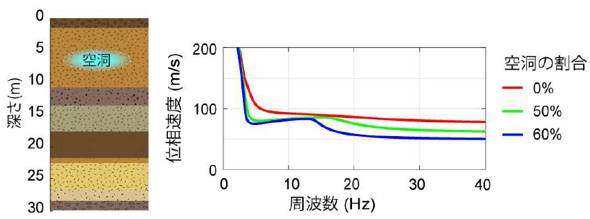 図5は、地中空洞が形成された場合の地盤特性の変化をシミュレーションした結果の一例を示しています。ここでは、空洞の情報として、地盤の一定体積に占める空洞の割合を用いてシミュレーションしています。この図のように、仮に地中空洞が形成されると、空洞における振動が伝搬する速度の低下により、曲線に違いが出ることが分かります。本手法による高頻度のモニタリングにより、このような地盤特性の変化を経時的に観測して検知することで、空洞化の予兆の推定ができることが期待できます。