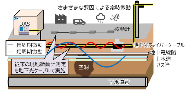 NTT株式会社(本社:東京都千代田区、代表取締役社長:島田 明、以下「NTT」)と国立研究開発法人 産業技術総合研究所(東京本部:東京都千代田区、理事長:石村 和彦、以下「産総研」)は、既存の通信光ファイバーを活用し、広範囲の地盤特性を常時モニタリングする手法を実証しました。さらに、空洞をモデル化したシミュレーションにより、地中空洞の形成を推定できる可能性を確認しました。道路陥没リスクの発見に向けた従来の地中空洞化調査は専用の機器を用いた現地測定が必要であったため、数年に1回程度の点検周期でしたが、本成果により、たとえば1日に1回といった高頻度で地中深さ約3~30mの広範囲の遠隔監視が可能になります。また、既存の地下管路(約62万km)に敷設済みの通信光ファイバーを活用できるため、さまざまな場所を効率的に検査できます。本技術は、既存インフラを活用した広域・低コストな監視を実現し、都市防災・減災やインフラ維持管理の高度化への貢献が期待されます。