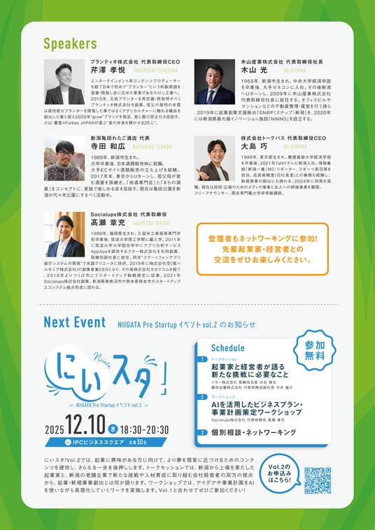 起業家支援・新規事業創出を手がけるSocialups株式会社(本社:新潟市中央区、代表取締役社長:高瀬章充 以下、当社)は、このたび新潟市主催の起業家・スタートアップ予備軍啓発交流イベント「にいスタ! NIIGATA Pre Startup イベントVol.1~きっかけは、ここにある。はじめの一歩を新潟から。~」を開催・運営します。