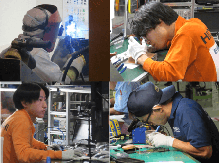 技能五輪全国大会「電気溶接」職種の大内選手(左上)、「電子機器組立て」の小口選手(右上)と海老沼選手(左下)、全国アビリンピック「電子機器組立」種目の松下選手(右下)