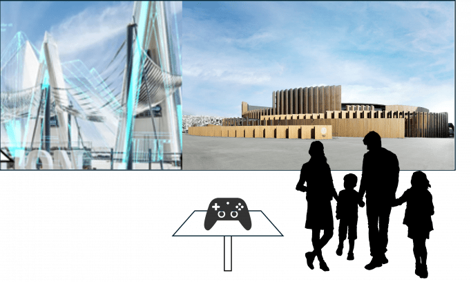 注目の展示は、万博閉幕直後に開催される「万博パビリオン3Dスキャン・VR展示」です。つまんで動かすことで、直感的に3D空間を動き回れるマウスを通じて、いくつかのパビリオンを歩き回ることができ、単なる三次元記録データにとどまらない、日建設計が設計に関わった万博パビリオンに実際に訪れたかのような追体験を可能にするバーチャルコンテンツとなっております。