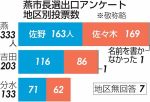 燕市長選は19日に投開票され、無所属新人で前市議の佐野大輔さん(41)が、無所属新人で元会社員の佐々木剛さん(59)にわずか144票の僅差で勝利した。鈴木力市長が4期目途中での辞職を表明し、15年半ぶりのトップ交代。大きな争点もなく、盛り上がりに欠けるといわれた選挙戦で、何が勝敗を分けたのか。選挙戦の戦いぶりや出口調査などから大接戦を振り返り、薄氷の船出となる新市政の課題を探る。(3回続きの2)