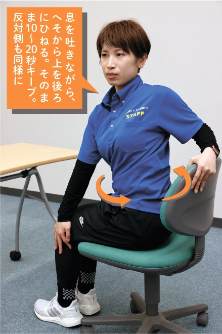 (2)へそから上を後ろへひねる。片方の手で椅子の背もたれをつかみ、反対の手で膝を動かないよう押さえる。10~20秒キープし、反対側も同様に行う。