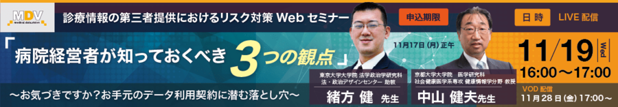メディカル・データ・ビジョン株式会社(東京都千代田区、代表取締役社長:岩崎博之)は診療情報の第三者提供におけるリスク対策無料Webセミナー「病院経営者が知っておくべき3つの観点」を、2025年11月19日(水)に開催します。セミナーの視聴を希望する方は、以下の登録URLからお申込みください。申込期限は11月17日(月)正午までです。