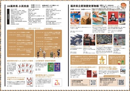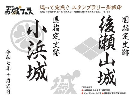 JA福井県小浜支店では、全国のお城団体など約30団体がブースを構え、フェス限定御城印を販売するなどして魅力を発信します。手すきの越前和紙にその場で揮毫する御城印など、各ブースが趣向を凝らして展開します。32ブースのうち20ブース以上を回ると限定グッズがもらえるデジタルスタンプラリーも開催します。