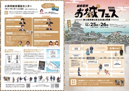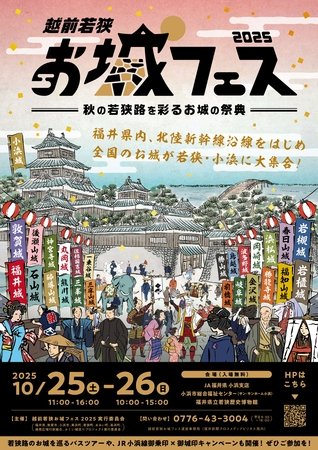 福井県内外のお城の魅力を発信するイベント「越前若狭お城フェス2025」が、2025年10月25日(土)、26日(日)に福井県小浜市で開催されます。福井県内をはじめ、北陸新幹線沿線地域や近隣府県など全国のお城関係団体が一同に会し、各城の魅力を紹介。石原良純さん、平山優さんら著名人による講演、ブース出展、体験講座などを通し、歴史ツーリズムの活性化を図ります。