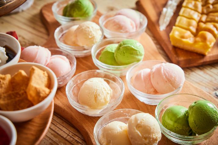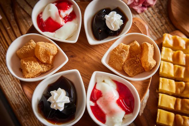 やわらかきな粉わらび餅、大人の珈琲ゼリー、炙って!ドーナツアイス、スイートポテトケーキ