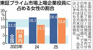 女性活躍を促す政府の後押しや、経営層の多様性を重視する投資家の要請などを背景に、県内プライム上場企業(11社)でも女性役員数は年々増えている。ただ、社外役員など外部からの人材活用が目立ち、今年増えた6人のうち...