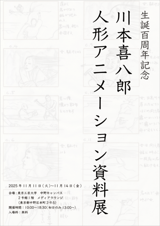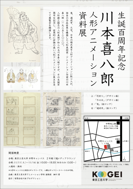 このたびの展覧会は、2003年に我が国初のアニメーション学科として設立された、東京工芸大学芸術学部アニメーション学科の設立時から2008年3月まで客員教授を務めた、川本喜八郎氏の生誕百周年を記念して開催される。