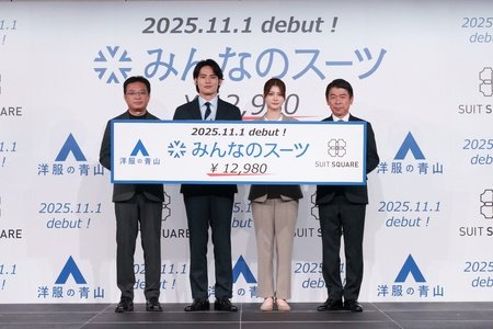 青山商事株式会社(本社:広島県福山市/代表取締役社長:遠藤 泰三)は、「洋服の青山」および「スーツスクエア」で発売する新シリーズ「みんなのスーツ」の立ち上げを記念し、2025年10月22日(水)、東京都港区のP.O.南青山ホールにて「洋服の青山/スーツスクエア 新商品・新キャラクター・新CM発表会」を開催いたしました。