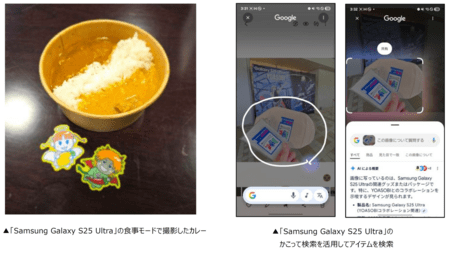 「100倍ズーム」や「約2億画素」以外にもグッズ撮影には「ポートレート撮影」、コラボグルメの撮影には「食事モード」などライブ会場で使える他の撮影モードもご体験いただきました。食事モードではYOASOBI監修のオリジナルカレーを撮影し、お米やカレーのツヤを際立たせつつ、背景をやわらかくぼかし、鮮やかな色合いに表現できました。また、会場内でポスターやアイテムを調べたい際に便利な「かこって検索」は、検索したいものをカメラで写し囲うだけで検索ができます。さらに会場で流れているBGMを聞かせるだけで簡単に楽曲を調べることもでき、ライブ参戦をさらに楽しむことができる機能が満載です。