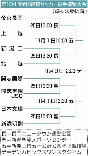サッカーの全国高校選手権県大会は8強進出チームが決まり、25日から準々決勝以降を行う。2大会ぶりの代表を目指す帝京長岡を中心に、前年の覇者新潟明訓、日本文理などが追う。