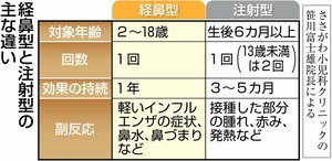 経鼻ワクチンは、製薬大手「第一三共」が開発した「フルミスト点鼻液」で、国内では昨シーズンから実用化された。左右の鼻にそれぞれ0・1ミリリットルを噴霧することで、インフルエンザの侵入経路でもある鼻の粘膜に免疫ができる。2〜18歳が対象で、...