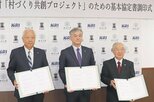 観光分野の県地域おこし協力隊員に任命された下村あす実さん(中央)=21日、県庁