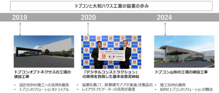 両社は、協業第一弾として、2019年12月に着工したトプコンの製造子会社である株式会社トプコンオプトネクサス(福島県田村市)の工場の建設工事では、敷地測量や基礎工事などの各工程において、BIMを用い、トプコンのデジタル測量機器やICT自動化施工技術を導入。その結果、現場作業の省力化、生産性が大幅に向上し、BIMと建設工事現場の連携に向けた実践的な取り組みの有効性が実証されました。