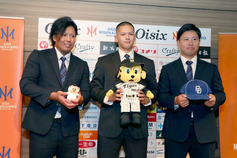 記念撮影に応じる、オイシックスの左から知念大成外野手、能登嵩都投手、牧野憲伸投手=新潟日報メディアシップ