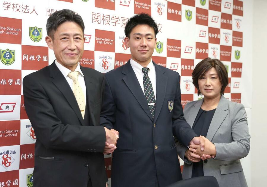 ドラフト会議でソフトバンクから育成1位を受け、両親と喜ぶ関根学園高校の池田栞太捕手(中央)=関根学園高校