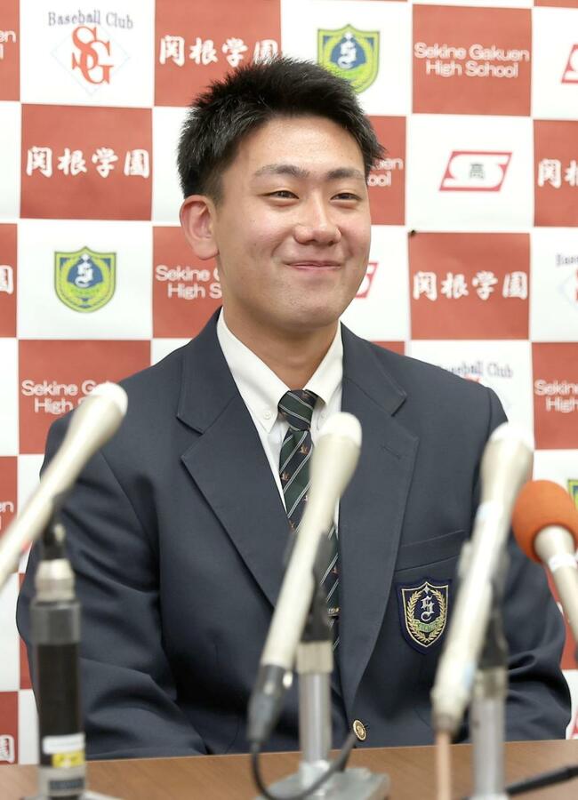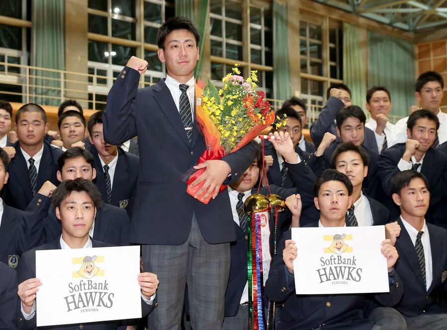 険しかった表情に笑顔が広がった。ソフトバンクから育成1位で指名された関根学園高の捕手池田栞太は「いつ呼ばれるか不安があったが...
