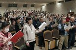 つるし灯籠の前で当日の発表練習をする新津第二小の児童=新潟市秋葉区新町