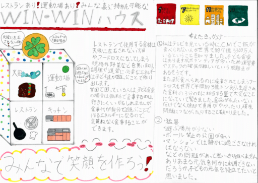 4回⽬の開催となった今回は、国内外から88点の応募があり、東京都⼋王⼦市⽴鑓⽔⼩学校6年⽣ 柳みくさんの作品「持続可能なWIN-WINハウス」が最優秀賞に選ばれました。