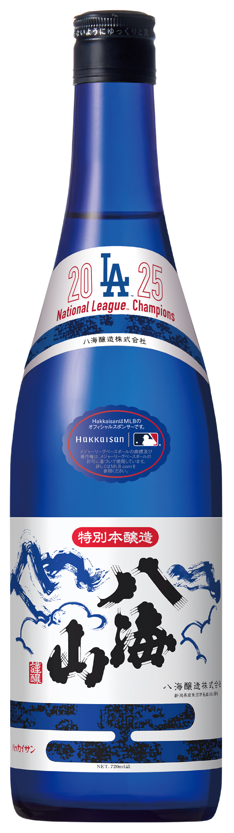 Hakkaisan 八海醸造株式会社グループ(本社:新潟県南魚沼市、代表取締役社長:南雲真仁、以下「Hakkaisan」)は、この度メジャーリーグ・ベースボール(以下「MLB」)の日本国内におけるオフィシャルスポンサーとなりました。その第一弾として、ナショナルリーグ西地区所属のロサンゼルス・ドジャースのナショナルリーグ優勝を記念し、MLB およびドジャースのロゴをあしらった限定ボトル「特別本醸造 八海山 ブルーボトル ナショナルリーグ優勝記念ラベル」を日本国内で発売いたします。