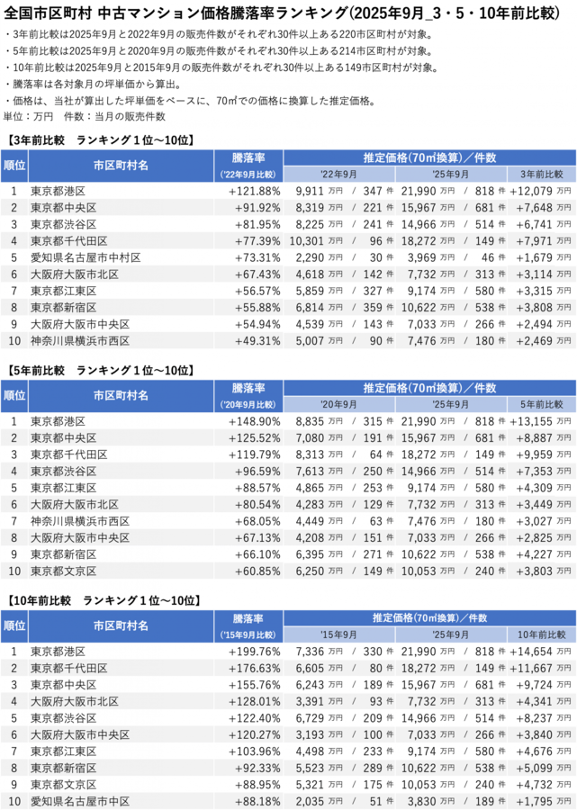 【全国市区町村 中古マンション騰落率ランキング(2025年9月_3・5・10年前比較)】