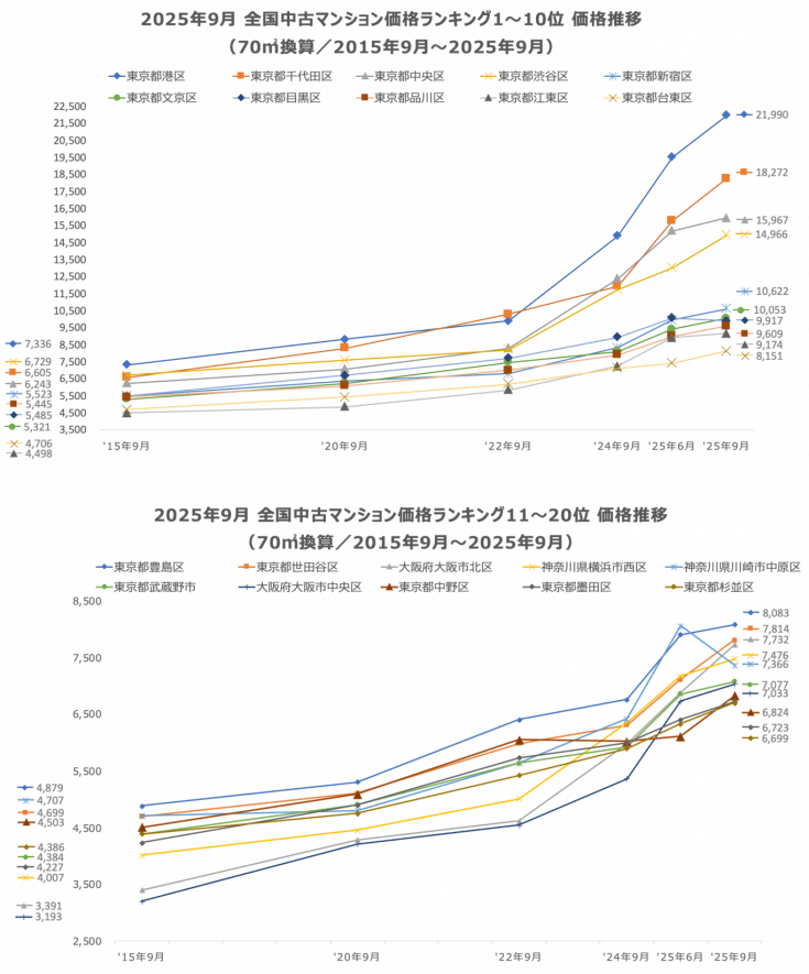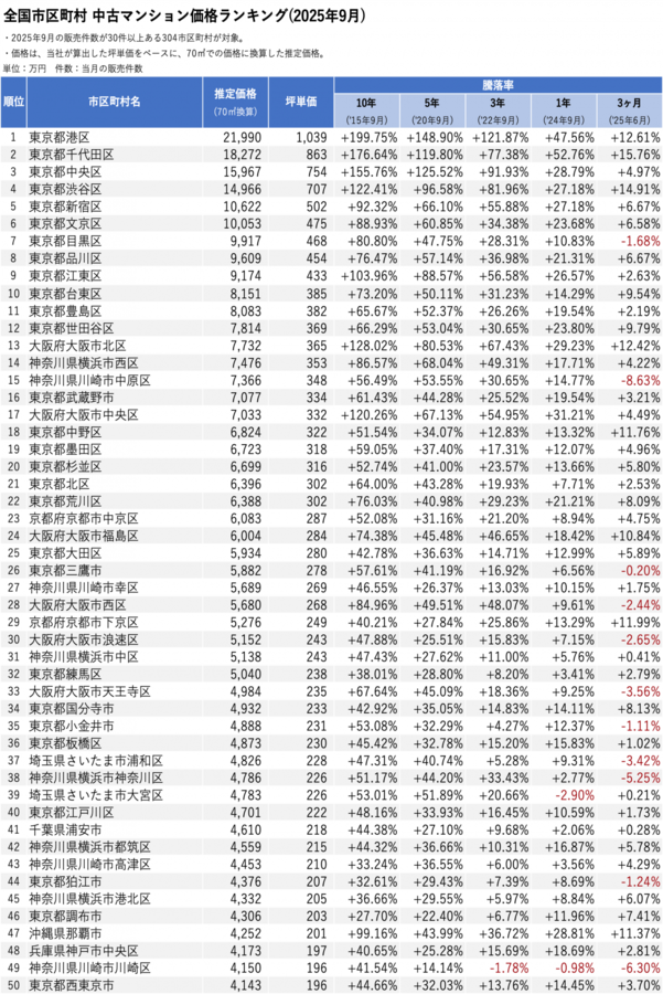 「不動産×WEB×ビッグデータ」の領域で、さまざまな不動産テックサービスを展開する株式会社ワンノブアカインド(本社:東京都港区、代表取締役社長:川島 直也、以下当社)は、当社が運営するマンション情報サイト「マンションレビュー」の保有データを元に、2025年9月の全国市区町村における中古マンションの相場を調査。坪単価をベースに70㎡の価格に換算した「中古マンション価格」*1と価格ランキング上位20件について過去10年間の価格推移、および1年前からの価格上昇率を表す「騰落率」のランキングを発表いたします。