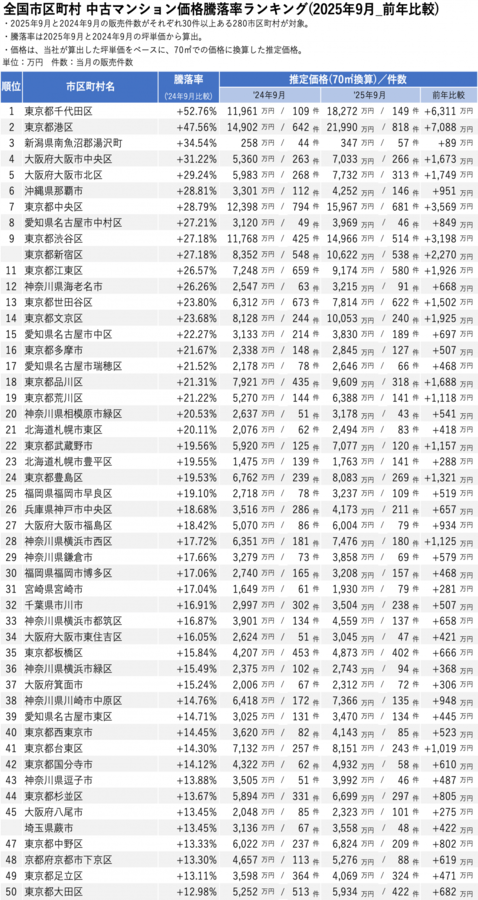 比較した騰落率からランキングを作成)は2025年9月と2024年9月の販売件数がそれぞれ30件以上ある280全国市区町村が対象。