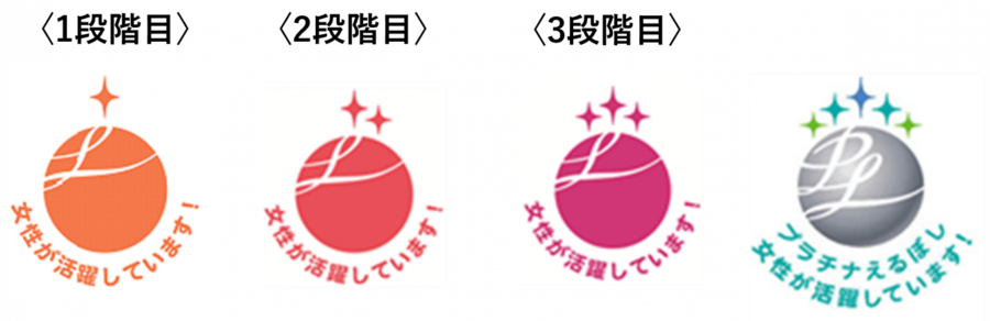 「えるぼし」認定等とは、女性の職業生活における活躍推進に取り組む企業であることを表すマークです。「えるぼし(1段階目、2段階目、3段階目)」、「プラチナえるぼし」認定の計4種類があります。