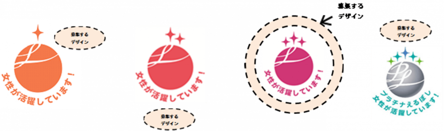 今回募集する「えるぼしプラス(仮称)」のデザインは1種類で、既存の4種類のマークにそれぞれ付加する形とし、職場における女性の健康支援に取り組んだ企業を表すマークとして一体的に使用(表示)します。
