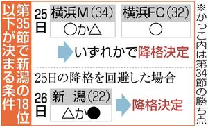 J1アルビレックス新潟は、25、26日に行われる次の第35節で、来季のJ2降格が決まってしまう状況にある。新潟は26日にホームで神戸と戦うが、25日の他チームの勝敗次第で、同日にJ2降格圏の18位以下が確定する可能性がある。