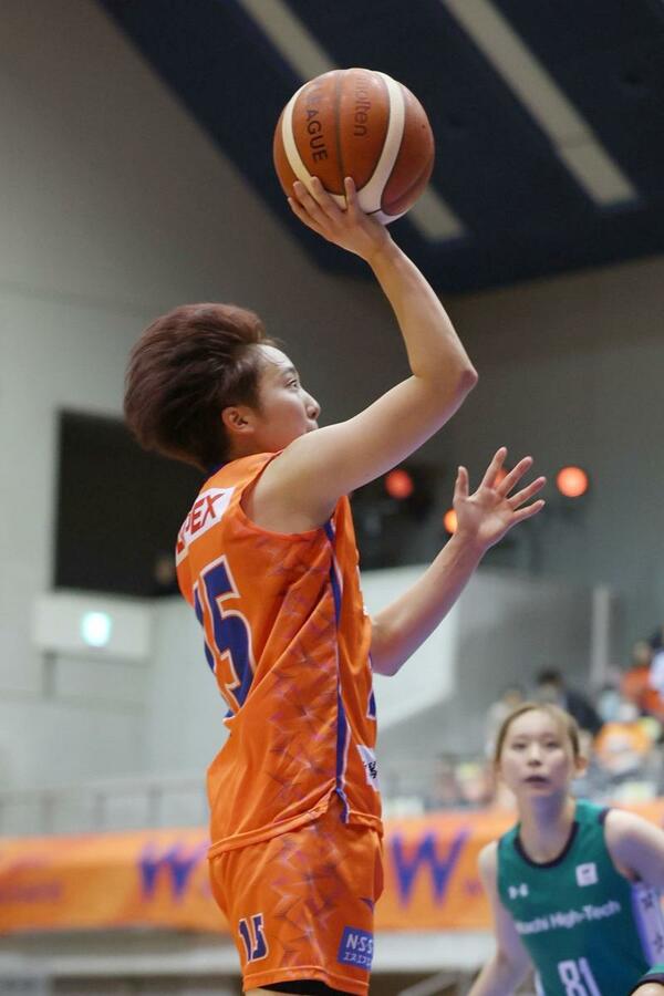 新潟-日立ハイテク 第1クオーター、ジャンプシュートを放つ金沢みどり=鳥屋野総合体育館