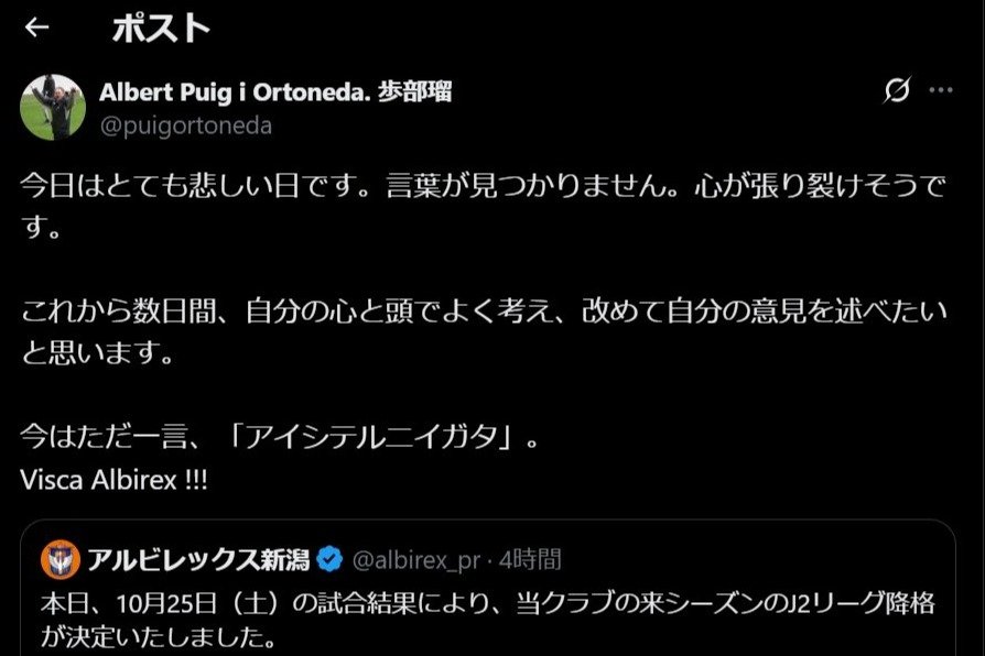 2020~21年にわたり指揮を執り、新潟にボールを保持するスタイルを植え付けたアルベル元監督もXでも古巣への思いを投稿した。
