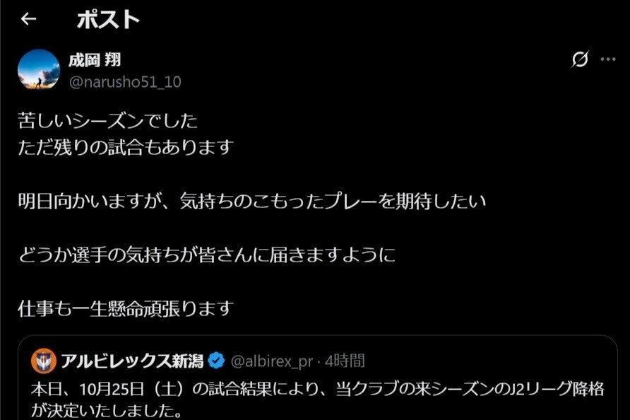 2013年から5季にわたり新潟でプレーし、近年は解説者としても活躍している成岡翔さんもXで次のようにコメントした。